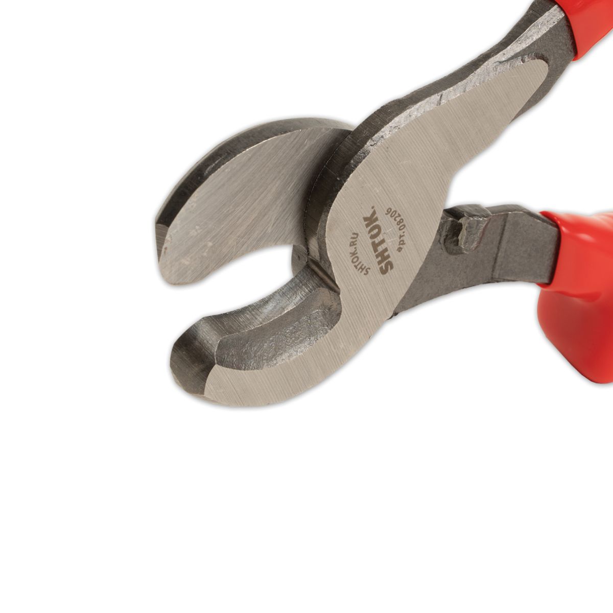 Диэлектрический кабелерез SHTOK 08206 выполнен из стали, обеспечивающей долгий срок эксплуатации инструмента. Рукоятки оснащены специальными упорами для надежности захвата и удержания инструмента. Возможна резка одно- и многожильного провода.