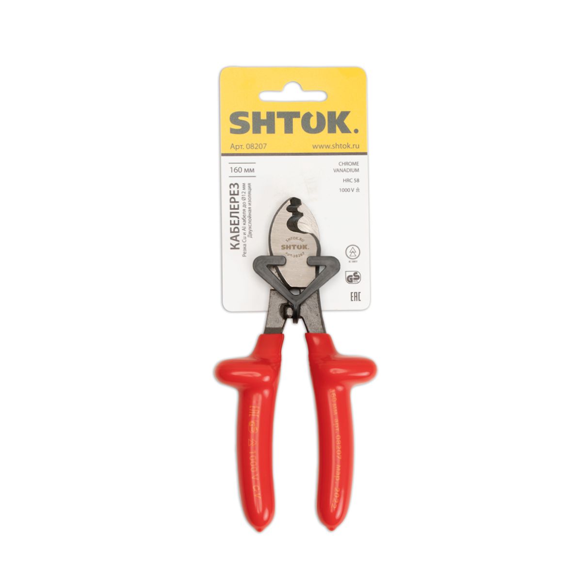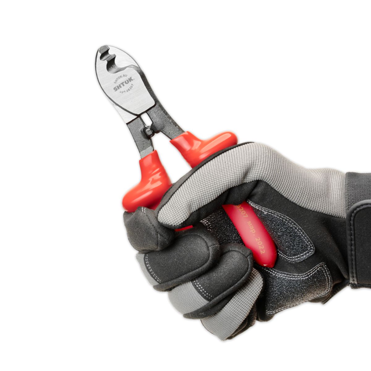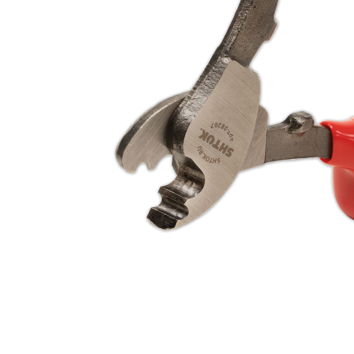 Диэлектрический кабелерез SHTOK 08207 используется для работы под напряжением. Инструмент выполнен из стали и оснащен удобными рукоятками. Предусмотрены специальные упоры на рукоятках для надежности удержания инструмента во время работы.
