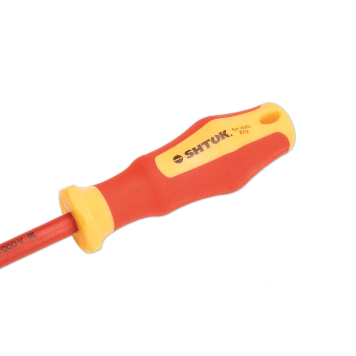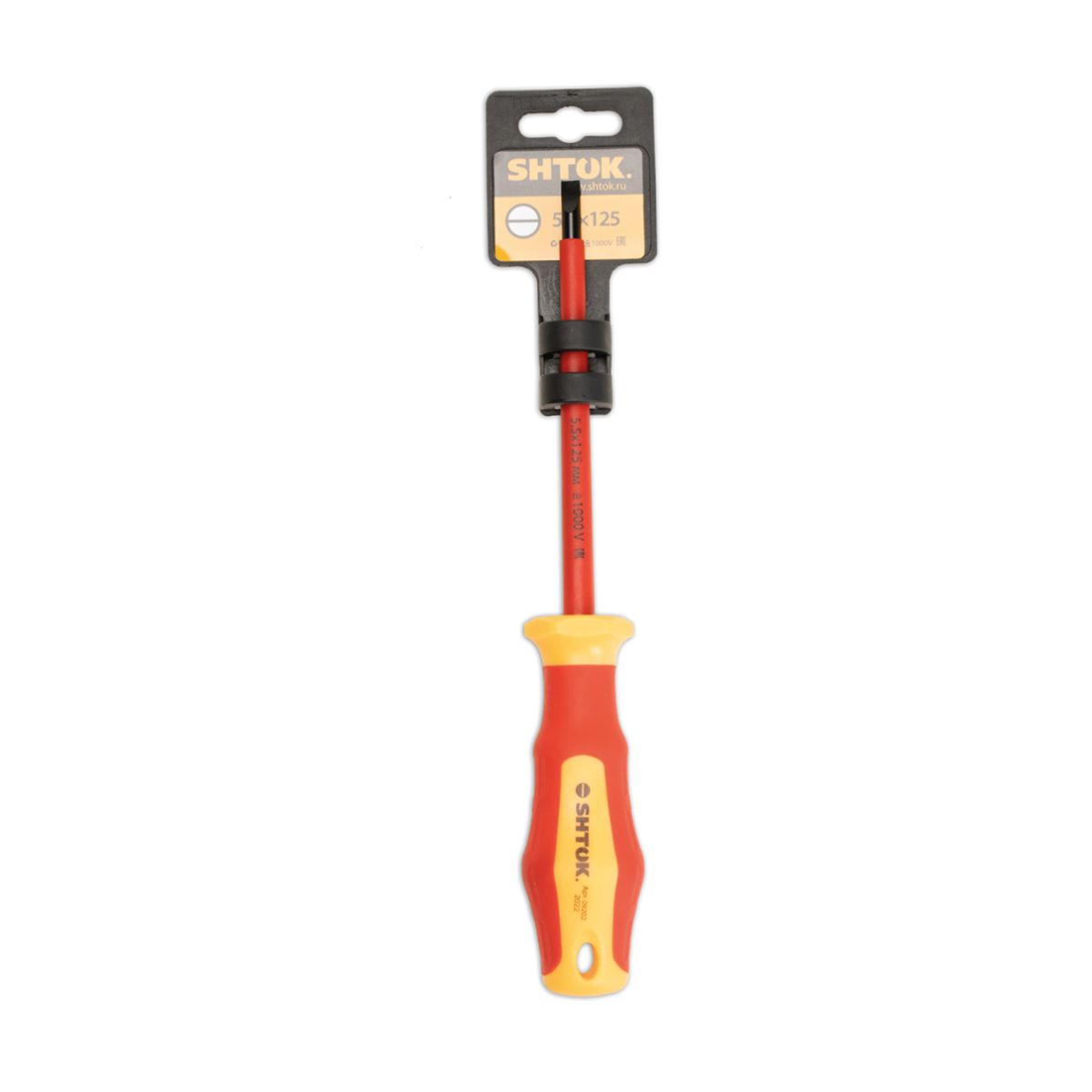 Диэлектрическая шлицевая отвертка SHTOK 1000В 5.5x125 мм 09202 используется для работ под напряжением. Отвертка оснащена рабочей частью из хром-ванадиевой стали. Предусмотрен магнитный наконечник, обеспечивающий удобство монтажа в расположенных вертикально приборах. Рукоятка удобной формы оснащена отверстием для подвешивания отвертки.