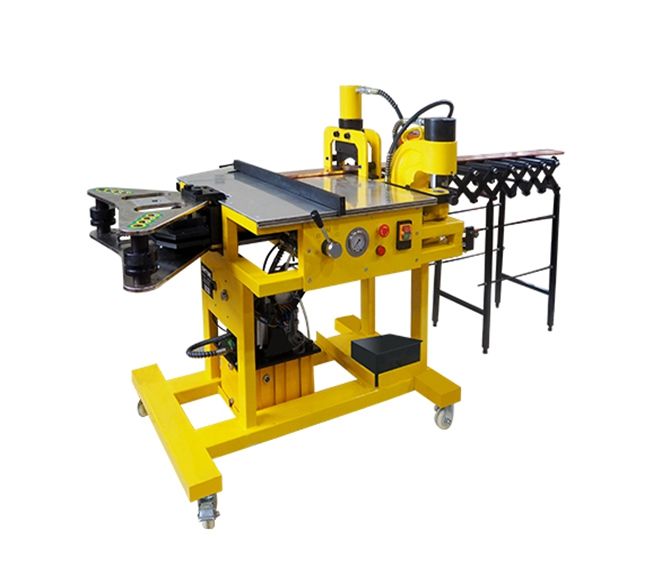 Шинообрабатывающий станок 3в1 SHTOK СРШ-200 21004 служит для резки, перфорации, гибки в вертикальной и горизонтальной плоскостях медной, алюминиевой токоведущей шины. Перфоратор с параллельным упором располагается у края рабочего стола, что дает возможность легко пробивать отверстия на фиксированном расстоянии. Перемещаемый рольганг предназначается для удобства подачи тяжелой шины. Благодаря аварийной кнопке останов агрегата в случае чрезвычайной ситуации осуществляется максимально быстро. Для мобильности и простоты перемещения оборудования в основании конструкции предусматривается наличие колес. Основные органы контроля и управления вынесены на лицевую панель, что способствует удобству эксплуатации. Габариты изделия составляют 1500х700х1100 мм.