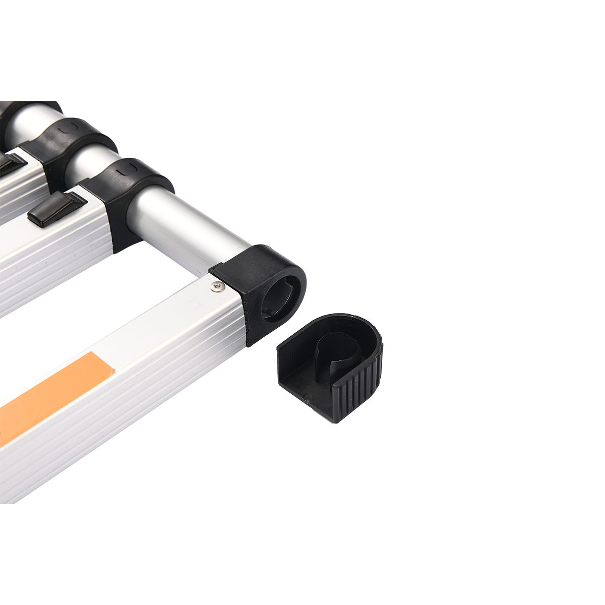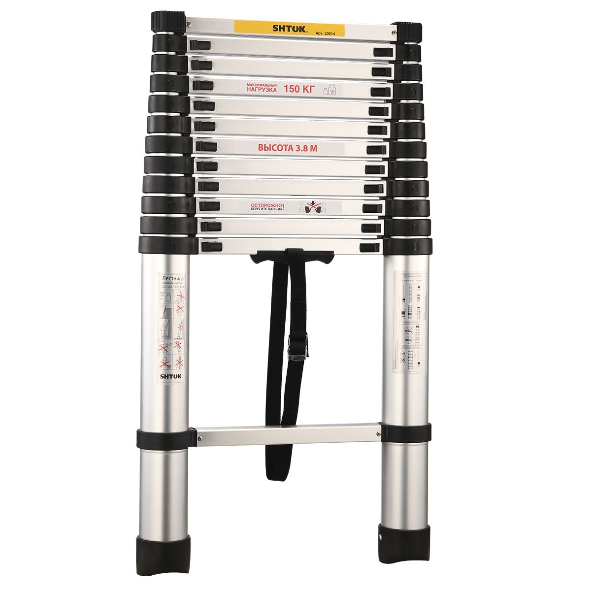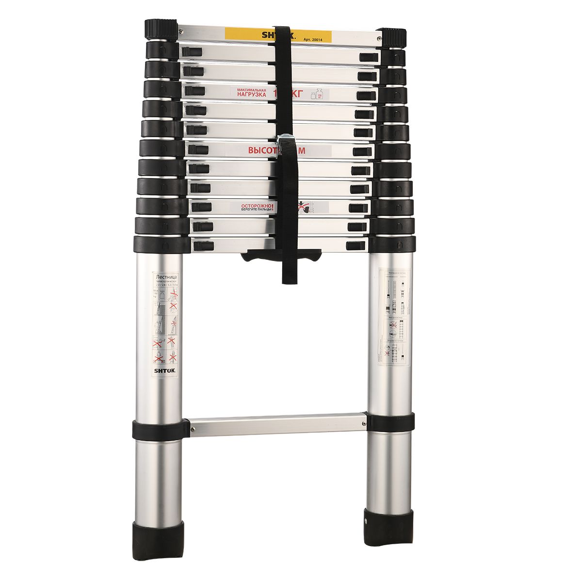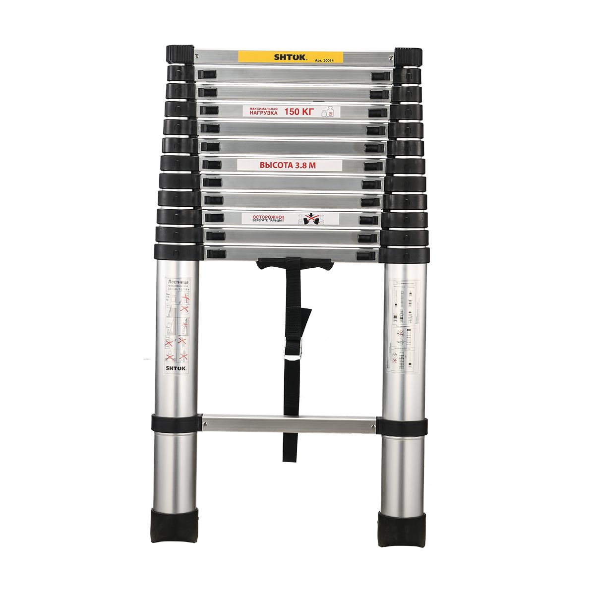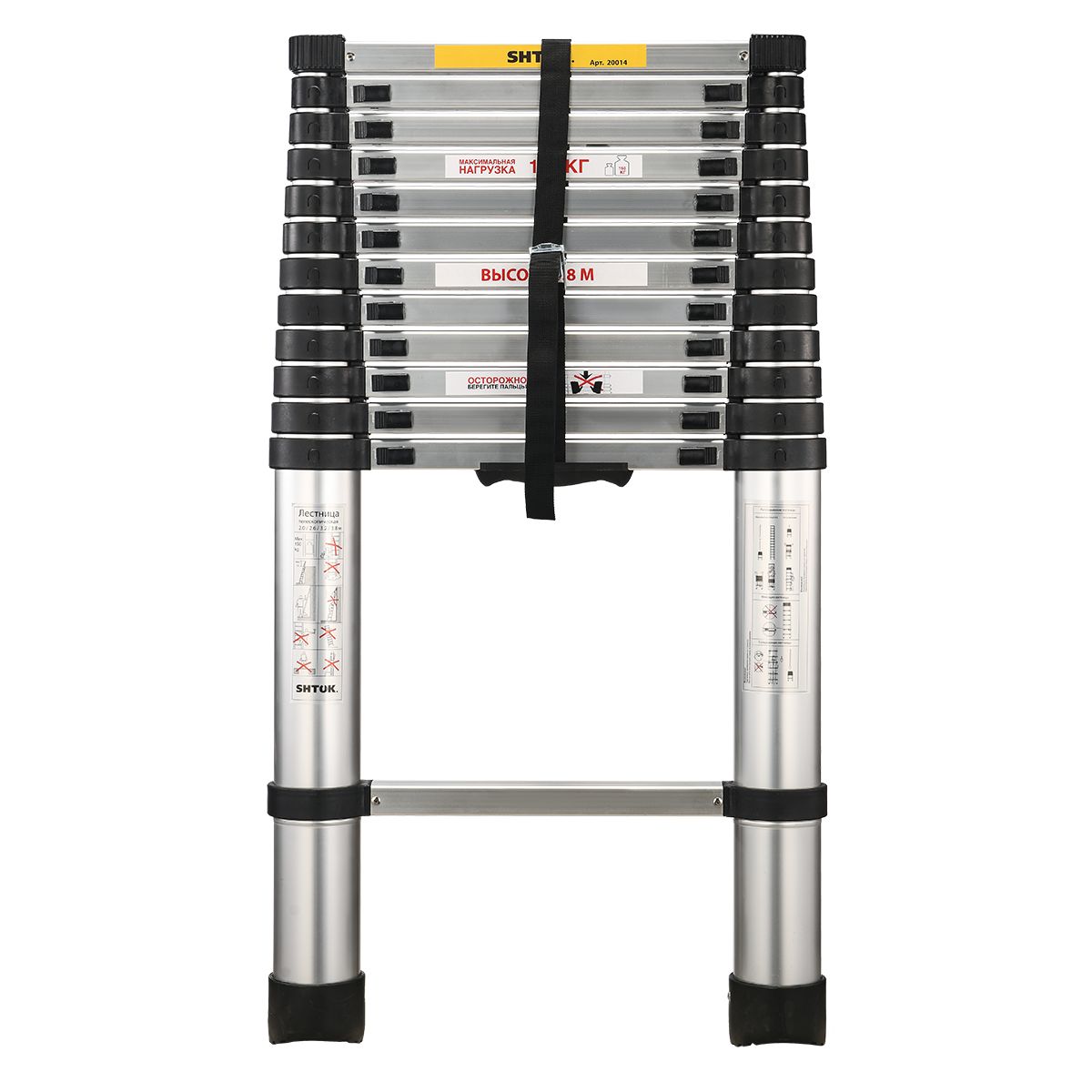 Телескопическая стремянка SHTOK 2.6м 20018 выдерживает нагрузку до 150 кг. За счет прочной конструкции из дюралюминия и первичного (переработанного) пластика обеспечивает надежность и долговечность использования. На стенде испытываемая стремянка выдерживает 10 000 циклов на раскрытие-закрытие.