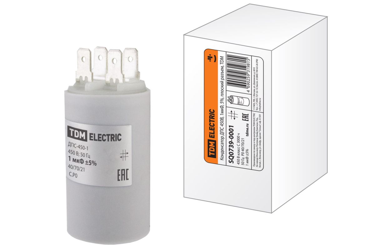 Читать все статьиКонденсатор ДПС 450В, 1мкФ, 5%, плоский разъем, TDM
