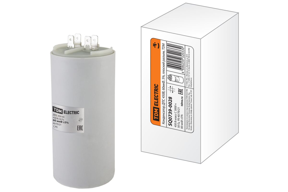 Читать все статьиКонденсатор ДПС 450В, 60мкФ, 5%, плоский разъем, TDM