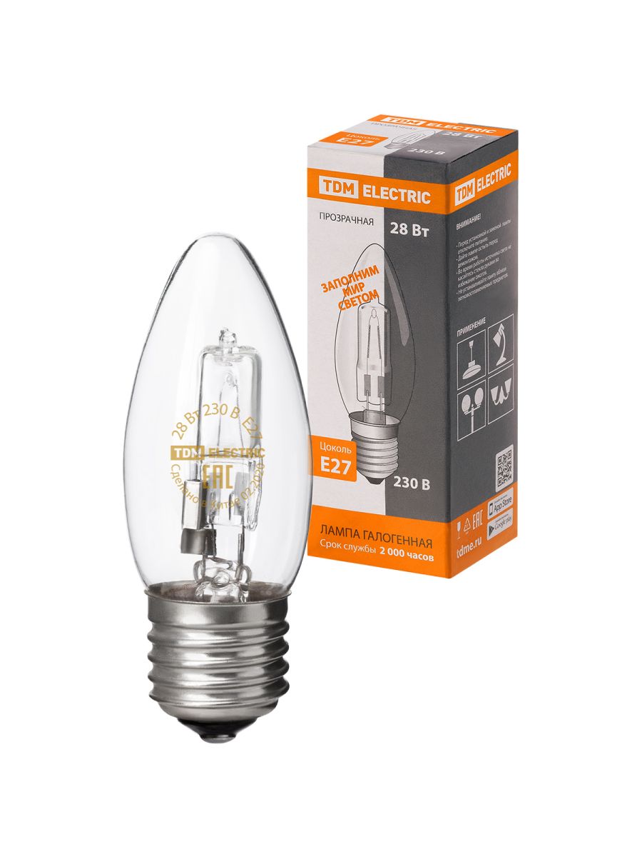Лампа галогенная «Свеча» прозрачная 28 Вт-230 В-Е27 TDM