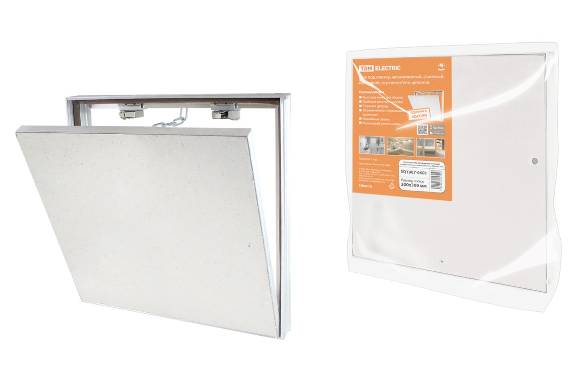 Люк под плитку, алюминиевый, съемный, нажимной, ограничитель-цепочка, 200х300, TDM