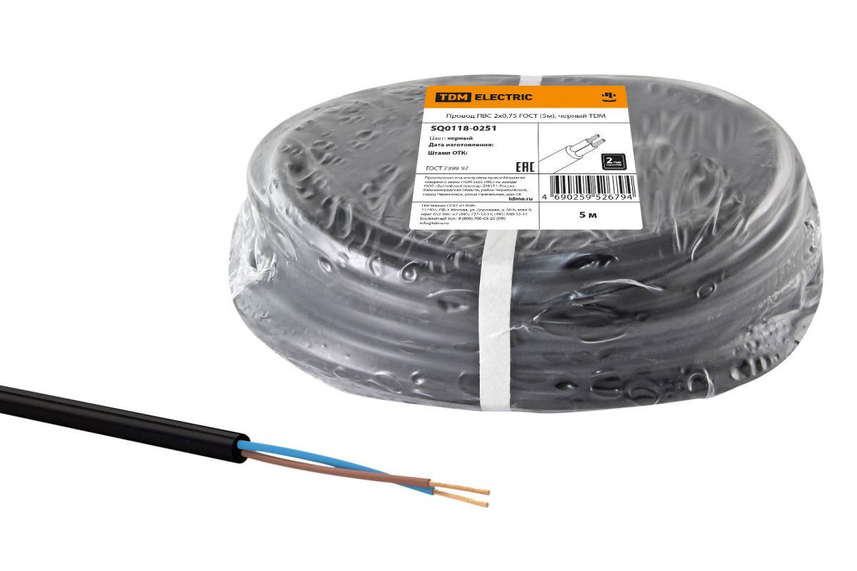 Провод ПВС 2х0,75 ГОСТ (5м), черный TDM